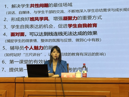 圍繞學(xué)生工作隊伍專業(yè)化發(fā)展,2022年全國高校輔導(dǎo)員年度人物、2020年上海高校輔導(dǎo)員年度人物、上海市育才獎獲得者,東華大學(xué)服裝與藝術(shù)設(shè)計學(xué)院學(xué)工辦主任魏冰結(jié)合自身的成長經(jīng)歷,從理想與現(xiàn)實的必然差異、初心與熱心的再次碰撞、職業(yè)與事業(yè)的相輔相成、思想政治教育工作迎來最好的時代等四個方面,講述了輔導(dǎo)員在專業(yè)化、專家化道路上的奮進(jìn)與拼搏,指出要跳出教育看教育,把握“用多大的力、對誰用情、如何用心”,以實現(xiàn)筑牢理論之基、提升政治站位、真正落實立德樹人根本任務(wù)。