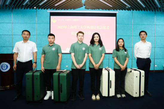 黨委研工部部長彭宗祥向暑期社會實(shí)踐團(tuán)隊(duì)代表授旗。上海市希望工程和青年志愿指導(dǎo)中心副主任陳劉棟、黨委組織部副部長孟志雷為西部志愿者發(fā)放學(xué)校紀(jì)念品。