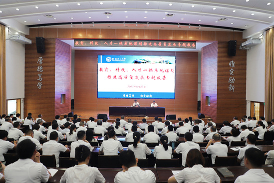 在主題教育期間,校長丁曉東認真貫徹落實主題教育相關要求,結合對上海理工大學近十年的辦學情況和問題調研,用系統(tǒng)科學的理論和方法解讀教育、科技、人才三位一體發(fā)展戰(zhàn)略并提出推進實踐的思考;為進一步推廣好經驗、好做法,加強主題教育成果分享與交流;8月22日至23日,丁曉東受邀分別到廣西師范大學和桂林理工大學作有關教育、科技、人才的專題報告。報告會分別由廣西師范大學黨委副書記、校長孫杰遠,桂林理工大學黨委書記鄧軍主持,兩校校領導、全體中層干部、科級干部參加報告會。