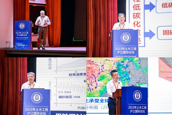 本次論壇瞄準(zhǔn)行業(yè)的熱點(diǎn)問題、前沿問題,為土木工程行業(yè)綠色高質(zhì)量發(fā)展提供中國智慧與國際視野。中國科學(xué)院院士、同濟(jì)大學(xué)孫鈞教授暢想海上交通運(yùn)輸建設(shè)的偉大革命,并探討了真空超導(dǎo)磁浮高速隧道工程的前期工作與運(yùn)行方案,為如何實(shí)現(xiàn)海上交通運(yùn)輸建設(shè)提供了啟發(fā)。日本工程院外籍院士、同濟(jì)大學(xué)汪發(fā)武教授分享了2023年土耳其卡赫拉曼馬拉什地震造成的損失分析,及其對中國雙碳戰(zhàn)略實(shí)現(xiàn)的啟示。澳大利亞技術(shù)科學(xué)與工程院院士、新南威爾士大學(xué)Nasser Khalili教授圍繞非飽和土力學(xué)展開主旨報(bào)告,為非飽和土力學(xué)的發(fā)展提供新思路。國際工程地質(zhì)與環(huán)境協(xié)會前主席、德國亞琛工業(yè)大學(xué)Rafig Azzam教授圍繞基于數(shù)據(jù)融合和數(shù)據(jù)挖掘的自組織滑坡監(jiān)測傳感器網(wǎng)絡(luò)作主旨報(bào)告,開發(fā)的滑坡預(yù)警原型系統(tǒng)為提高滑坡預(yù)警準(zhǔn)確性提供參考。東南大學(xué)巖土工程學(xué)科首席科學(xué)家劉松玉教授分享了巖土工程低碳化技術(shù)創(chuàng)新與應(yīng)用,包括巖土工程智能化和巖土工程固碳技術(shù)等,實(shí)現(xiàn)了巖土工程有效碳利用,為土木工程學(xué)科踐行“雙碳”戰(zhàn)略提供了新思路。國家杰出青年科學(xué)基金獲得者、國家重點(diǎn)基礎(chǔ)研究發(fā)展計(jì)劃“973計(jì)劃”青年首席科學(xué)家、同濟(jì)大學(xué)科研管理部部長馮世進(jìn)教授全面分析了濱海軟土地層能源群樁熱力相互作用機(jī)制,為地?zé)崮芮鍧嵞茉囱a(bǔ)充供熱技術(shù)和濱海巖土與工程地質(zhì)發(fā)展提供參考。國家杰出青年科學(xué)基金獲得者、教育部特聘教授、同濟(jì)大學(xué)黃雨教授圍繞土體大變形流動的時空演化規(guī)律、多相態(tài)轉(zhuǎn)變的致災(zāi)機(jī)制、演化評估及災(zāi)害防治研究作分享報(bào)告。