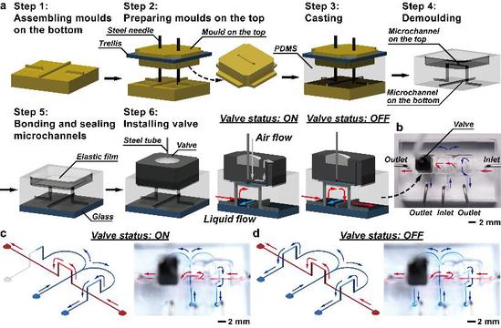 模塊化微流控制造技術(shù)通過組裝各種預(yù)制的模塊,拼搭出整個(gè)微流控系統(tǒng)。近些年,各種模塊制造技術(shù)及模塊組裝技術(shù)陸續(xù)被提出。模塊的制造可以通過在晶圓上制備多種微結(jié)構(gòu),再用類似聚二甲基硅氧烷(PDMS)的彈性材料復(fù)刻出模塊結(jié)構(gòu)。這些模塊可以通過粘接靈活地組裝成一個(gè)完整的系統(tǒng)。此外,微流控模塊也可以利用3D打印制造。