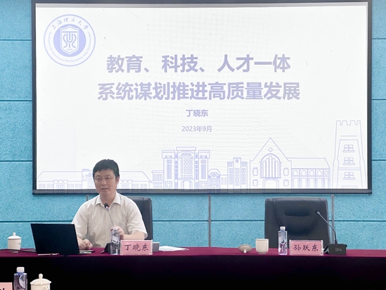 丁曉東以“教育、科技、人才一體系統(tǒng)謀劃推進高質(zhì)量發(fā)展”為題,通過“以系統(tǒng)觀念謀劃教育、科技、人才一體化發(fā)展”“以‘科教融匯、產(chǎn)教融合’促進教育、科技、人才一體化發(fā)展”“以人才隊伍建設激活教育、科技、人才一體化發(fā)展”“以身體力行促進教育、科技、人才一體化發(fā)展”四個層面做了全面深入的解讀。他將學校在產(chǎn)教融合、醫(yī)工交叉,人才隊伍建設等方面的舉措和做法作為鮮活案例,探討了學校踐行教育、科技、人才“三位一體”系統(tǒng)一體化發(fā)展的創(chuàng)新思路,提出了高質(zhì)量發(fā)展的“上理方案”。他強調(diào),青年教師要以習近平新時代中國特色社會主義思想為指導,堅持系統(tǒng)觀念,加強思維訓練、行為訓練以及管理方法訓練,以守師之德、強師之能,努力做精于傳道授業(yè)解惑的“經(jīng)師”和“人師”。他希望所有青年教師都能成為用生命影響生命的一束光,在學校高質(zhì)量發(fā)展的進程中為學校添光增彩。