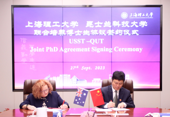 會上,雙方簽署兩校聯(lián)合培養(yǎng)博士生協(xié)議,共同培養(yǎng)高水平人才。隨后,昆士蘭科技大學(xué)校長代表團(tuán)一行實地走訪能源材料科學(xué)研究院,與研究院師生親切交流,就籌建USST-QUT聯(lián)合研究中心的可行性等方面開展了深入交流。