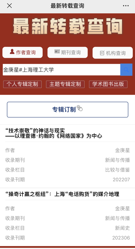 原刊載在《新聞?dòng)浾摺?022年第4期,金庚星為獨(dú)立作者的學(xué)術(shù)論文“‘技術(shù)崇敬’的神話與現(xiàn)實(shí)——以理查德·約翰的<網(wǎng)絡(luò)國(guó)家>為中心”,被《新聞與傳播》于2022年第7期全文轉(zhuǎn)載。原刊載在新聞學(xué)與傳播學(xué)頂級(jí)學(xué)術(shù)期刊《新聞與傳播研究》2023年第3期,金庚星為獨(dú)立作者的學(xué)術(shù)論文“‘操奇計(jì)贏之樞紐’:上?!娫捹?gòu)貨’的媒介地理》,被《新聞與傳播》于2023年第6期全文轉(zhuǎn)載。