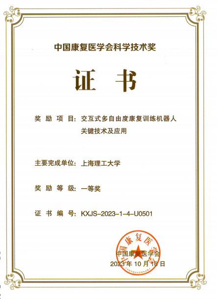 近日,中國康復(fù)醫(yī)學(xué)會2023年度綜合學(xué)術(shù)年會在北京國家會議中心舉行,會上頒發(fā)學(xué)會本年度科學(xué)技術(shù)獎(jiǎng),上海理工大學(xué)智能康復(fù)工程研究院院長喻洪流教授牽頭完成的“交互式多自由度康復(fù)訓(xùn)練機(jī)器人關(guān)鍵技術(shù)及應(yīng)用”成果榮獲2023年度中國康復(fù)醫(yī)學(xué)會科學(xué)技術(shù)獎(jiǎng)一等獎(jiǎng)。這也是我國康復(fù)工程領(lǐng)域首個(gè)康復(fù)訓(xùn)練機(jī)器人科技成果獎(jiǎng)項(xiàng),表明我校在康復(fù)訓(xùn)練機(jī)器人領(lǐng)域的研究達(dá)到國內(nèi)領(lǐng)先水平,獲得行業(yè)同行的高度認(rèn)可。