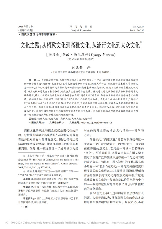 近日,由悉尼大學(xué)哲學(xué)系喬治·馬爾庫(kù)什撰寫,版藝學(xué)院副教授付玉竹譯作,發(fā)表于《學(xué)習(xí)與探索》的學(xué)術(shù)論文《文化之路:從精致文化到高雅文化,從流行文化到大眾文化》被《新華文摘》(2023第14期)全文轉(zhuǎn)載。