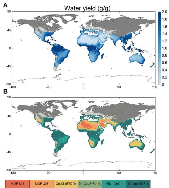 該研究分別從取水能力和能量需求兩方面入手,基于熱力學(xué)、氣象學(xué)理論建立了可靠的取水系統(tǒng)模型,對金屬有機框架(MOFs)進行全球應(yīng)用潛力分析;結(jié)合全年高分辨率全球氣象數(shù)據(jù),為金屬有機框架空氣取水裝置的高效部署提供了指導(dǎo)。最終建立了吸附劑適用基準,可為特定地區(qū)特定氣候的吸附式空氣取水技術(shù)提供了評估,并證明了空氣取水技術(shù)在干旱地區(qū)的可靠性。