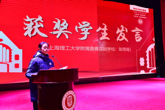 附屬嘉善實驗學(xué)校陳雨瑤代表獲獎學(xué)生發(fā)言,她表示既要追尋五角星的星光,又要追尋上理之星的榮光,知不足而奮進(jìn),望遠(yuǎn)山而前行。附屬楊浦少云中學(xué)曹瑛老師以《乘上理東風(fēng),繪教育夢想》為題代表獲獎教師發(fā)言,她表達(dá)了感謝、感恩、感動之情,今后將更加飽滿的熱情勤勉工作、不負(fù)信任,為學(xué)生成長成才貢獻(xiàn)力量。