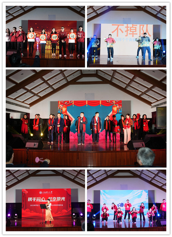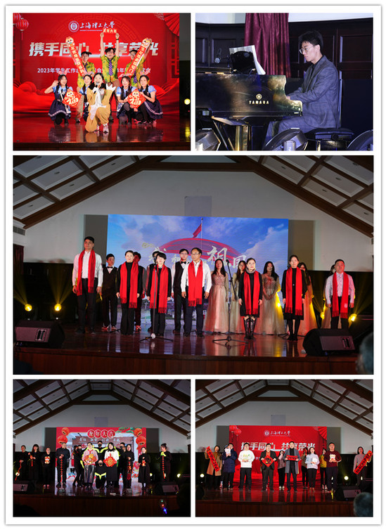 本次聯(lián)歡會分為“同心”、“同行”、“同夢”三個(gè)篇章,彰顯了新時(shí)代參與和支持學(xué)生工作的上理人與學(xué)生同心、與學(xué)校同行、與國家同夢的昂揚(yáng)面貌。在“同心”篇章中,由研工部帶來的開場曲《我和我的祖國》,唱響了我們對祖國母親的深情,展現(xiàn)學(xué)工人心底對祖國最熾熱的情感;版藝學(xué)院的歌舞表演《Try everything》帶大家走入了“瘋狂動物城”,用節(jié)奏鮮明的非洲鼓和活潑熱情的歌舞展現(xiàn)出了蓬勃的朝氣;基礎(chǔ)學(xué)院唯美的鋼琴獨(dú)奏《Cornfield Chase》用音樂詮釋了對學(xué)生無私的愛;在《與“理”同心 展翅高飛》中,管理學(xué)院和理學(xué)院巧妙運(yùn)用光影,通過充滿創(chuàng)意的聯(lián)袂演出展現(xiàn)了學(xué)工人在2024同心同行,一同展翅高飛的決心;環(huán)建學(xué)院和滬江學(xué)院的歌舞表演《在大大的上理工愛你》展現(xiàn)了學(xué)工人在大大的上理工挖到的寶藏——對學(xué)生、學(xué)校和家國的愛。