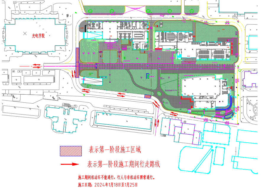 我校軍工路516號校區(qū)改擴建工程教學(xué)樓標(biāo)段正在室外總體施工,計劃開始道路施工,屆時將封閉勤勉大道局部道路(光電學(xué)院門前東側(cè)),為保證行人通行,該區(qū)域施工將分為兩個階段(見附圖):第一階段施工日期為1月18日至1月25日(混凝土道路養(yǎng)護(hù)時間至2月5日),第二階段施工時間為1月26日至2月5日(混凝土道路養(yǎng)護(hù)時間至2月15日)。第二階段施工時間內(nèi),請需到達(dá)勤勉大道以南校園區(qū)域及四公寓、五食堂的機動車從軍工路516號大門駛?cè)?,請需到達(dá)圖書館方向的機動車從軍工路580號大門駛?cè)耄怆妼W(xué)院西側(cè)繞行。