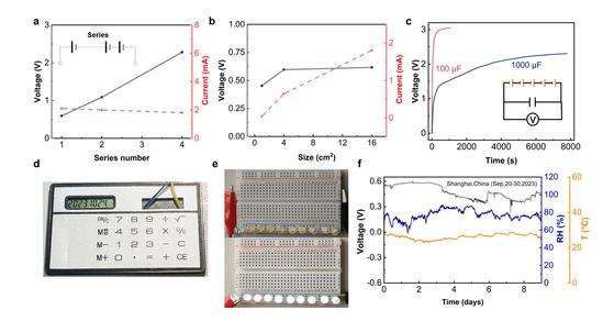 本研究通過將二氧化硅納米纖維、海藻酸鈉和氯化鈣浸漬的還原氧化石墨烯基質(zhì)結(jié)合在一起,構(gòu)建了一種高效發(fā)電薄膜。由該薄膜構(gòu)成的濕度發(fā)電器件單個(gè)便可產(chǎn)生高達(dá)~0.6V的開路電壓和~2.24mA的短路電流。該輸出性能達(dá)國際領(lǐng)先水平,是已報(bào)道濕度發(fā)電器件的10倍以上。此外,該器件能在相當(dāng)寬的溫度和相對(duì)濕度范圍內(nèi)保持~0.6 V的電壓輸出,在長達(dá)10天左右的長時(shí)間戶外測試中一直能保持0.4-0.6 V左右的電壓輸出,顯示了極為良好的環(huán)境適應(yīng)性與持久性。