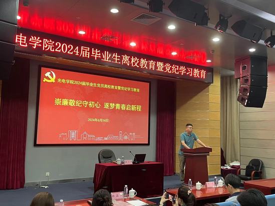 為推動黨紀(jì)學(xué)習(xí)教育走深走實(shí),加強(qiáng)畢業(yè)生黨員離校教育,6月14日下午,光電學(xué)院開展主題為“崇廉敬紀(jì)守初心,逐夢青春啟新程”的畢業(yè)生黨員離校教育暨黨紀(jì)學(xué)習(xí)教育。學(xué)院全體畢業(yè)生黨員和預(yù)備黨員參加教育。