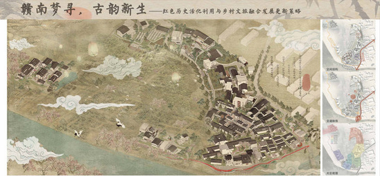 作品說明:本次江西贛州片區(qū)的鄉(xiāng)村景觀設(shè)計(jì)更新,旨在對紅色遺產(chǎn)進(jìn)行開發(fā),結(jié)合產(chǎn)業(yè)轉(zhuǎn)型深入挖掘保護(hù)本土風(fēng)貌?;诋?dāng)?shù)厣鷳B(tài)環(huán)境形成以濱江紅飄帶景觀為核心的紅色文旅融合景觀,注重保護(hù)提升鄉(xiāng)村的傳統(tǒng)風(fēng)貌、優(yōu)化產(chǎn)業(yè)結(jié)構(gòu)和提升基礎(chǔ)建設(shè)等方面加強(qiáng)綜合性規(guī)劃,打造贛南建筑的文化品牌并提升其整體形象和品質(zhì)。