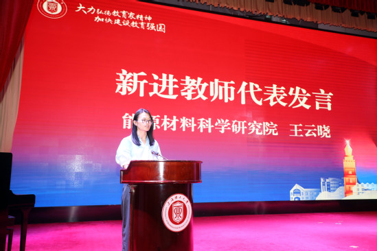 活動(dòng)第三篇章,名為《初心》的40名教師從教感言視頻展現(xiàn)了上理教師從事教育事業(yè)的熱忱和決心。朱新遠(yuǎn)宣讀從事教育工作30年教師名單并頒發(fā)榮譽(yù)證書(shū),教齡32年的外語(yǔ)學(xué)院高文成老師分享了他的育人感悟。隨后,新進(jìn)教師宣誓儀式舉行,2023年寶鋼優(yōu)秀教師獎(jiǎng)獲得者宇振盛上臺(tái)領(lǐng)誓。能源與材料科學(xué)研究院王云曉作為新進(jìn)教師代表發(fā)言。