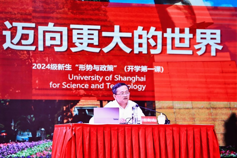 典禮結(jié)束后,朱新遠(yuǎn)為新生們講授第一課。他從校史出發(fā),為新生們講述了上海理工大學(xué)的辦學(xué)歷史,展示了學(xué)校一路發(fā)展走來所取得的各類成果,希望新生們傳承校訓(xùn)精神,做胸懷天下、志存高遠(yuǎn)的新時(shí)代上理人,成長為社會(huì)和國家的棟梁之才。接著他向新生們介紹了學(xué)校的食宿住行及現(xiàn)代化、科技化的科研學(xué)習(xí)空間,展示了未來校園建設(shè)藍(lán)圖,鼓勵(lì)同學(xué)們努力提高自身綜合能力,充分利用學(xué)校提供的學(xué)科資源和科研平臺(tái),成就更好的自己。最后,朱新遠(yuǎn)分享了學(xué)校的整體辦學(xué)理念和辦學(xué)優(yōu)勢,各學(xué)院的綜合實(shí)力和專業(yè)前景,鼓勵(lì)新生們?cè)诳平膛d國戰(zhàn)略、人才強(qiáng)國戰(zhàn)略、創(chuàng)新驅(qū)動(dòng)發(fā)展戰(zhàn)略的布局下,利用好上海的城市優(yōu)勢,在奮進(jìn)新征程中書寫人生華章,為學(xué)校的學(xué)科建設(shè)和科技創(chuàng)新作出應(yīng)有的貢獻(xiàn),努力成為有理想、敢擔(dān)當(dāng)、能吃苦、肯奮斗的新時(shí)代好青年。