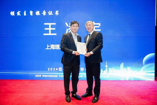 王凌宇(右一)為竇世學頒發(fā)主旨報告證書