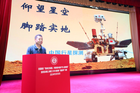 “天問”探火、“北斗”指路……在廣袤無垠的蒼穹上,中國航天交出了一份無愧于時代的輝煌答卷。耿言以“仰望星空,腳踏實地——中國行星探測工程”為題,以我國首次火星探測任務(wù)的論證、規(guī)劃、任務(wù)立項、研制的過程為主線,為師生們講述了我國火星探測歷程。