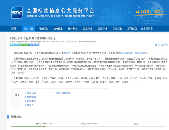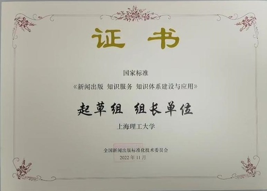 上海理工大學(xué)擔(dān)任《新聞出版 知識(shí)服務(wù) 知識(shí)體系建設(shè)與應(yīng)用》國(guó)家標(biāo)準(zhǔn)的起草組組長(zhǎng)單位,副組長(zhǎng)單位包括清華大學(xué)出版社有限公司、海南大學(xué)、河北領(lǐng)先文化傳播有限公司、中圖科信數(shù)智技術(shù)(北京)有限公司、武漢大學(xué)、中國(guó)新聞出版研究院。