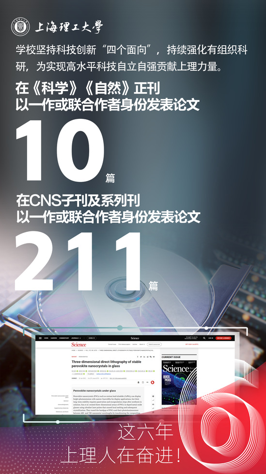 這六年,上海理工大學堅持科技創(chuàng)新“四個面向”,持續(xù)強化有組織科研,為實現(xiàn)高水平科技自立自強貢獻上理力量。在《科學》《自然》正刊以一作或聯(lián)合作者身份發(fā)表論文10篇,在CNS子刊及系列刊以一作或聯(lián)合作者身份發(fā)表論文211篇。