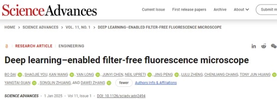該成果由上海理工大學(xué)光電信息與計算機工程學(xué)院莊松林院士、常務(wù)副院長張大偉教授帶領(lǐng)的超精密光學(xué)制造團隊與上海交通大學(xué)附屬仁濟醫(yī)院浦南分院、美國杜克大學(xué)合作,創(chuàng)新提出了“AI熒光成像——無濾波熒光顯微成像技術(shù)”,可廣泛應(yīng)用于生物診斷、臨床醫(yī)學(xué)、環(huán)境監(jiān)測、刑偵勘探等領(lǐng)域,相關(guān)論文“支持深度學(xué)習(xí)的無濾光片熒光顯微鏡(Deep learning-enabled filter-free fluorescence microscope)”發(fā)表在《科學(xué)》(Science)子刊《科學(xué)進展》(Science Advances)上。上海理工大學(xué)戴博教授為第一作者,張大偉教授、上海交通大學(xué)醫(yī)學(xué)院附屬仁濟醫(yī)院浦南分院管陽太教授和美國杜克大學(xué)Tony Jun Huang教授為通訊作者,碩士研究生游少杰、博士研究生龍嚴(yán)和陳鈞一參與研究工作。