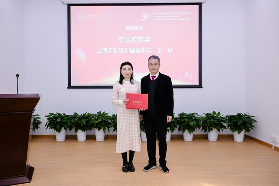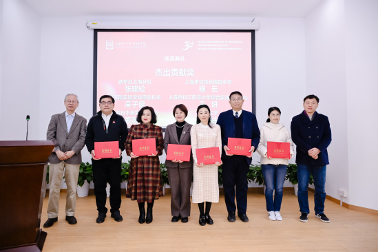 外語學(xué)院黨委書記曲德強(qiáng)主持日語專業(yè)成立三十周年頒獎(jiǎng)儀式。他指出,風(fēng)雨兼程三十載,春華秋實(shí)育英才。日語系的發(fā)展源于社會(huì)各界的大力支持。上海市教育委員會(huì)國際交流處原副處長張進(jìn)、上海市人民對(duì)外友好協(xié)會(huì)日本處原處長張雪娜為上海市甘泉外國語中學(xué)校長楊云、包玉剛實(shí)驗(yàn)學(xué)校原總校長吳子健、上海市松江區(qū)青少年綜合實(shí)踐教育中心副主任王妍、新華社高級(jí)記者張建松、上海日本研究交流中心負(fù)責(zé)人姜咪紅、上海市日本學(xué)會(huì)副會(huì)長馬利中頒發(fā)“杰出貢獻(xiàn)獎(jiǎng)”。上海市教育工會(huì)干部吳波、外語學(xué)院副院長韓戈玲為日語系榮休教師張繼彤、張蓮群、張文碧、徐彭陽頒發(fā)“杰出育才獎(jiǎng)”。外語學(xué)院黨委副書記金小東為外語學(xué)院日語系第一屆本科生、上海市甘泉外國語中學(xué)副校長王丹頒發(fā)“杰出校友獎(jiǎng)”。