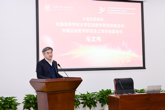 大會(huì)閉幕式由上海大學(xué)日語系主任趙瑩波主持。中國日語教學(xué)研究會(huì)上海分會(huì)副會(huì)長毛文偉在總結(jié)致辭中指出,外語學(xué)科在新時(shí)代背景下肩負(fù)重要使命,人工智能對(duì)學(xué)科發(fā)展起到支撐作用,為新時(shí)期的人才培養(yǎng)機(jī)制提供了新的可能。