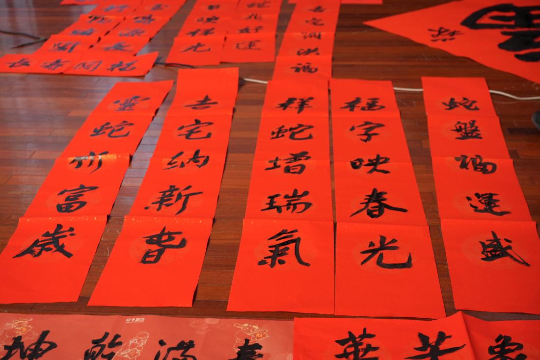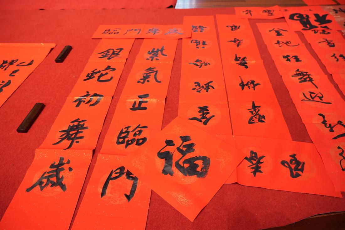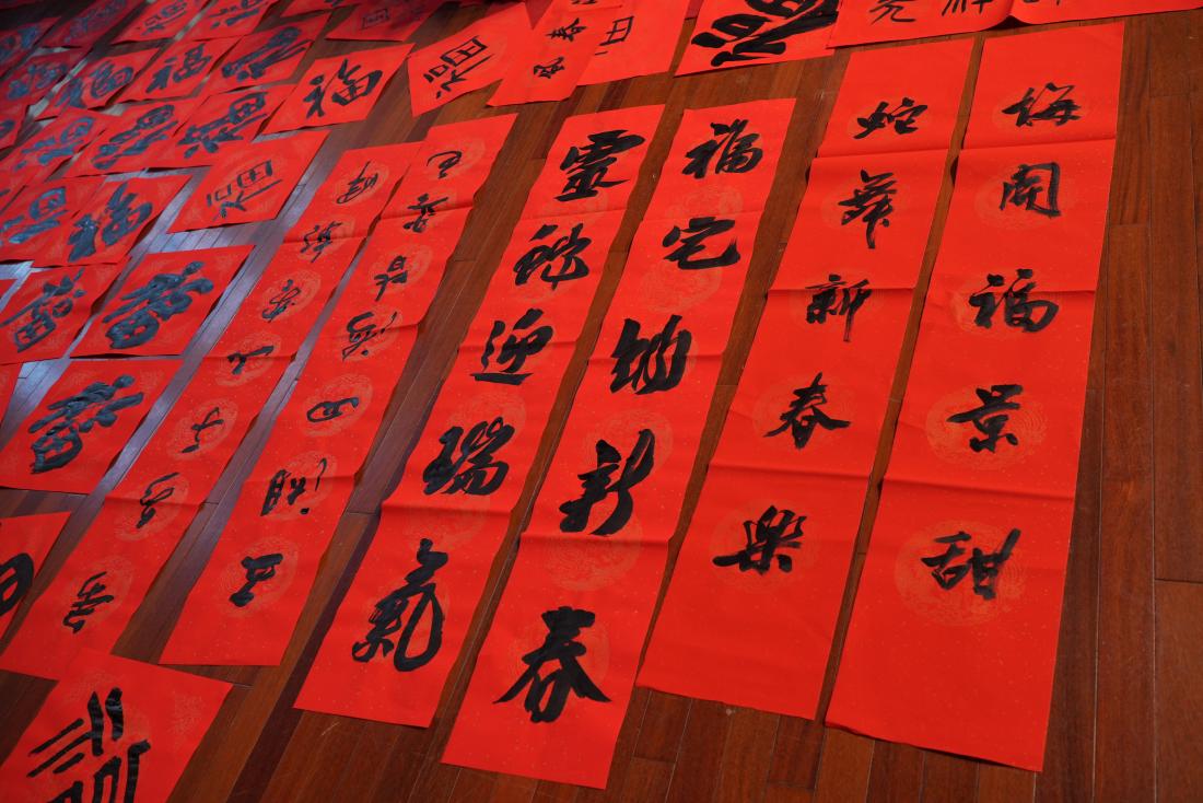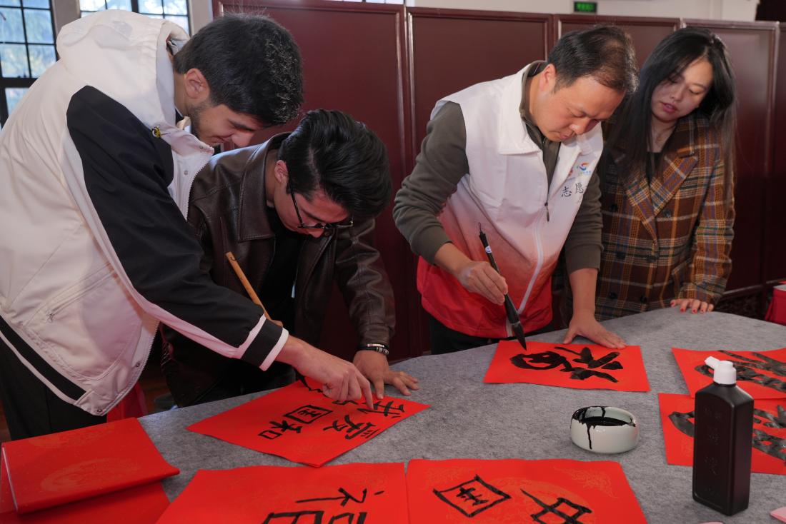 活動(dòng)現(xiàn)場氣氛熱烈。十余位書法家筆酣墨飽,洋洋灑灑書寫春聯(lián),一筆一劃間,滿心的祝福和美好的愿望躍然紙上。萬福迎春紅紅火火,現(xiàn)場的留學(xué)生也對(duì)中國書法表現(xiàn)出濃厚的興趣。他們積極與書法家互動(dòng)創(chuàng)作,在專業(yè)指導(dǎo)下,寫出了一個(gè)個(gè)氣韻生動(dòng)寓意美好的“福”字,于一番酣暢淋漓的創(chuàng)作之中春風(fēng)得意歡聲笑語,實(shí)實(shí)在在地深度體驗(yàn)了中國書法藝術(shù)的魅力與精彩。