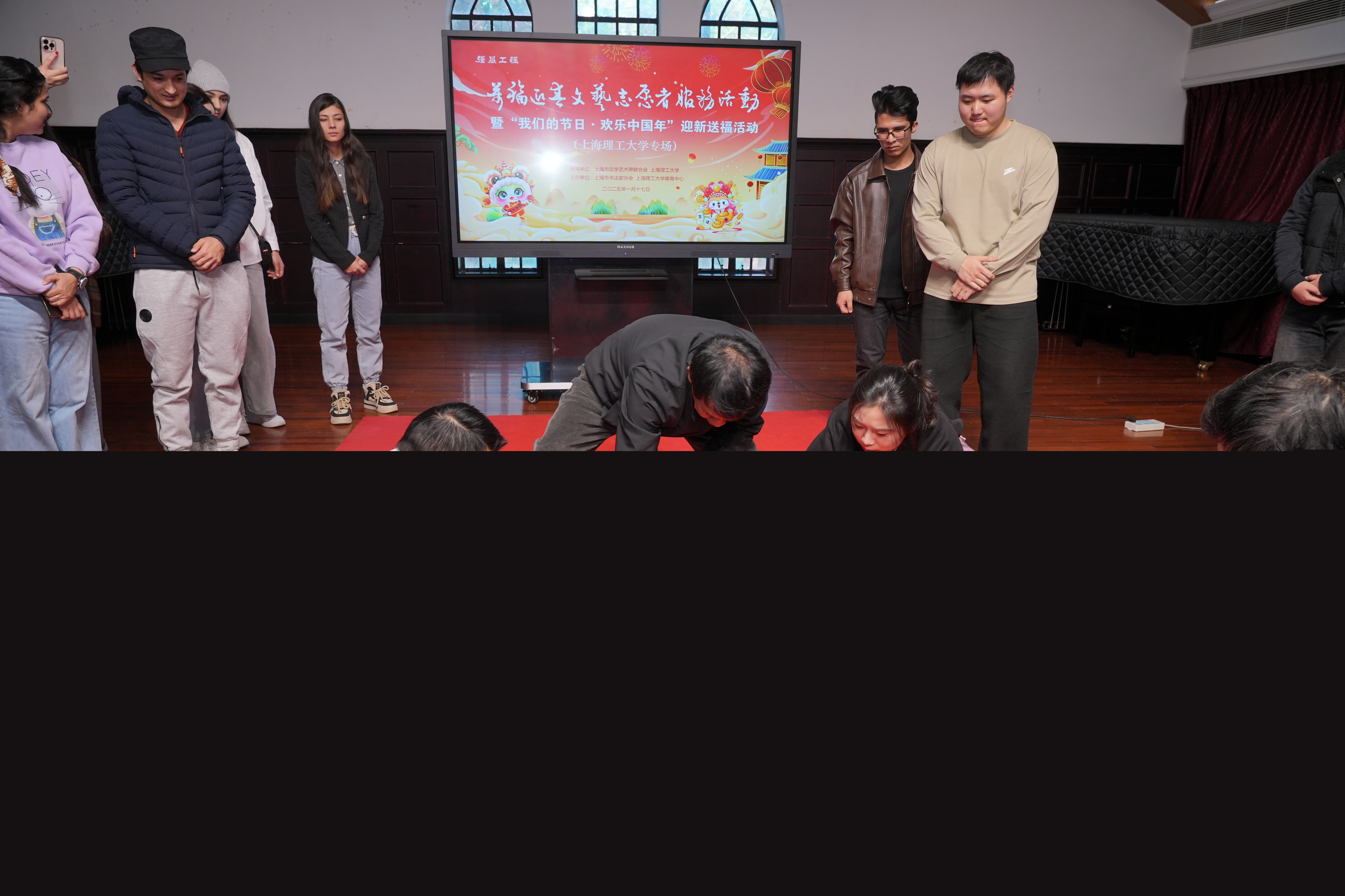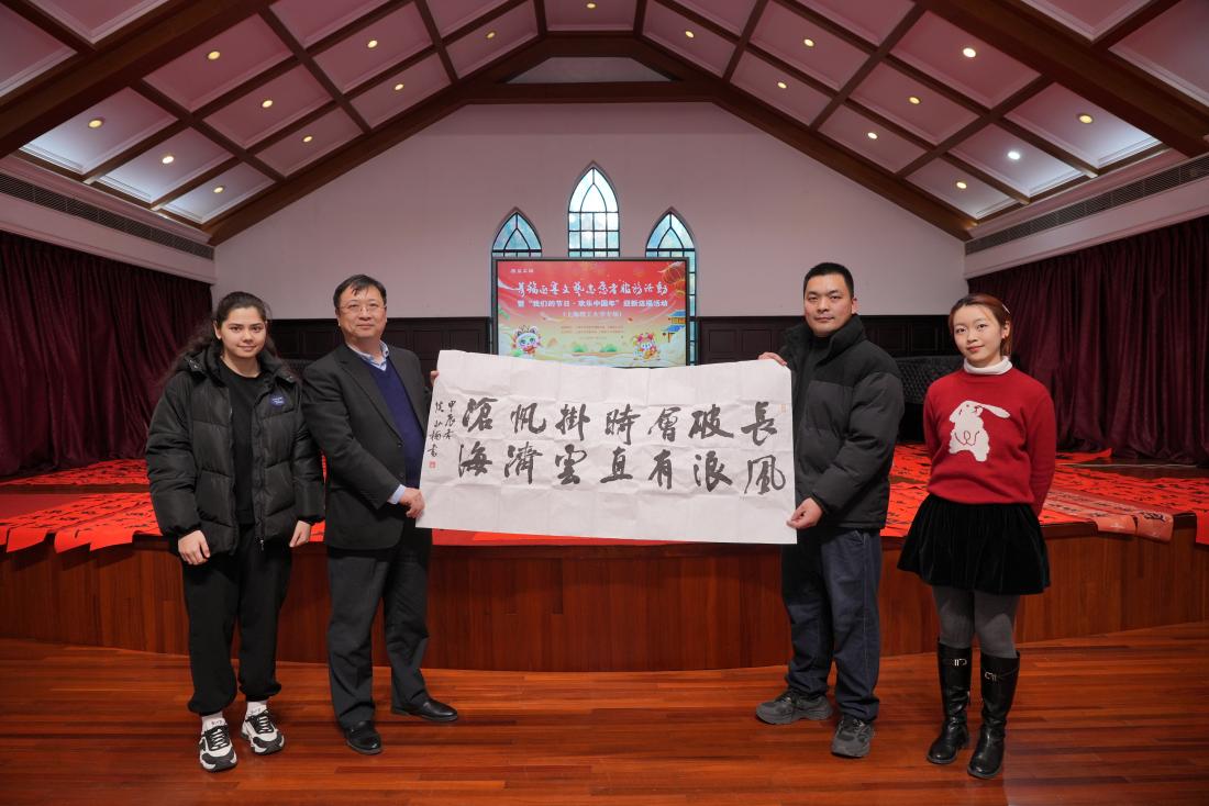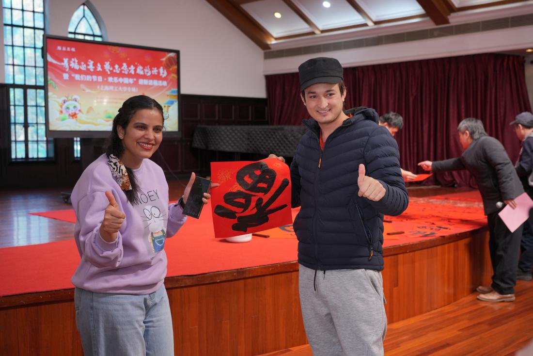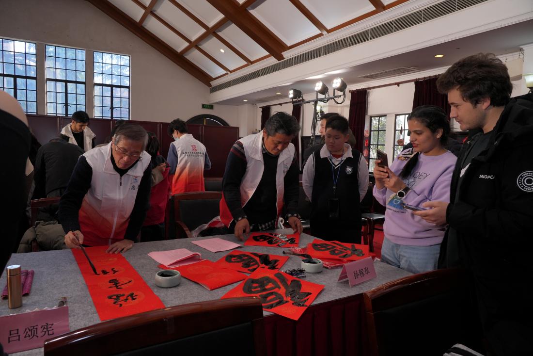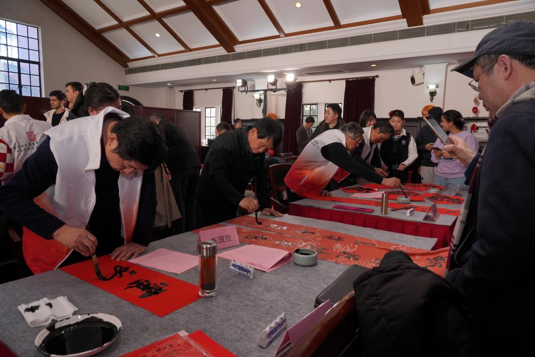 1月17日下午,上海市書法家協(xié)會(huì)代表團(tuán)走進(jìn)上海理工大學(xué),在音樂堂揮毫潑墨,為我校師生書寫春聯(lián)傳遞情誼,共同喜迎乙巳新春。我校美育中心主任、滬江學(xué)院常務(wù)副院長陳紅,美育中心專職副主任、滬江學(xué)院副院長朱慧鋒,滬江學(xué)院教師以及中外學(xué)生代表出席活動(dòng),滬江學(xué)院書法教師董劍戟主持活動(dòng)。