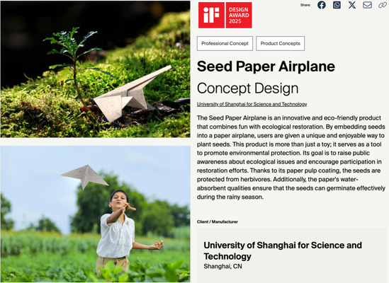 此次獲獎作品涵蓋環(huán)保教育和醫(yī)療關(guān)懷兩個領(lǐng)域,作品分別名為《種子紙飛機(Seed Paper Airplane)》《月相胰島素注射筆(Luna phase stamp insulin pen injection)》。