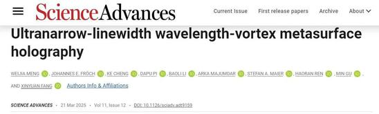 這項(xiàng)研究的背后,是一支橫跨三大洲的科學(xué)聯(lián)合團(tuán)隊(duì),由上海理工牽頭,澳大利亞莫納什大學(xué)、美國(guó)華盛頓大學(xué)等機(jī)構(gòu)的專家們跨越時(shí)區(qū)壁壘,云端協(xié)作攻克技術(shù)難關(guān)。通過“虛擬實(shí)驗(yàn)室”共享實(shí)時(shí)數(shù)據(jù),利用跨國(guó)設(shè)備接力完成超表面制備與測(cè)試?!熬拖裼萌蛑腔燮闯鲆粡埻昝廊D,”方心遠(yuǎn)研究員感慨道。這種無國(guó)界科研模式,不僅驗(yàn)證了超窄線寬超表面全息作為光學(xué)密碼鎖的可行性,更凸顯了國(guó)際合作在科研中的重要性以及在重大科研突破中體現(xiàn)的中國(guó)主導(dǎo)力。