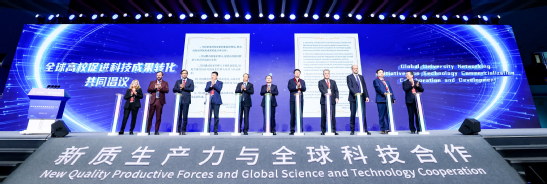 開(kāi)幕式上,朱新遠(yuǎn)與哈爾濱工業(yè)大學(xué)校長(zhǎng)、中國(guó)科學(xué)院院士韓杰才,西安交通大學(xué)校長(zhǎng)、中國(guó)工程院院士張立群,北京工業(yè)大學(xué)校長(zhǎng)、中國(guó)工程院院士聶祚仁,清華大學(xué)副校長(zhǎng)曾嶸等11位中外大學(xué)校長(zhǎng)一同上臺(tái)按下發(fā)起鍵,向全球高校發(fā)出“促進(jìn)科技成果轉(zhuǎn)化共同倡議”。