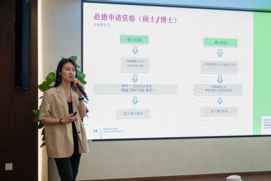 徐文婕系統(tǒng)梳理了德國留學的核心優(yōu)勢與申請路徑。她指出,德國公立大學實行“免學費”政策,文憑國際認可度高,特別在工程、自然科學及人工智能領(lǐng)域保持世界領(lǐng)先地位,隨著英語授課項目廣泛設立,赴德留學門檻進一步降低,中國留學生人數(shù)持續(xù)增長。徐文婕還詳細介紹了不同學歷層次的申請條件。大家最關(guān)心的生活費問題,她也以詳細的統(tǒng)計數(shù)據(jù)做出解答。