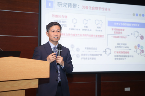 游書力院士以“合成化學(xué)工具創(chuàng)新”為切入點(diǎn),系統(tǒng)展示了其團(tuán)隊(duì)在芳香化合物不對(duì)稱轉(zhuǎn)化領(lǐng)域的最新研究成果。他通過抗癌藥物中間體合成的典型案例,闡明新反應(yīng)在縮短合成步驟、提升產(chǎn)物選擇性方面的突出優(yōu)勢(shì),并指出激發(fā)態(tài)化學(xué)研究將推動(dòng)合成方法學(xué)從“經(jīng)驗(yàn)探索”向“理性設(shè)計(jì)”跨越。此外,游院士還介紹了高效催化技術(shù)在多類天然產(chǎn)物合成中的應(yīng)用進(jìn)展,強(qiáng)調(diào)該成果不僅為芳香化學(xué)品轉(zhuǎn)化提供了新路徑,更為新型不對(duì)稱催化劑的開發(fā)奠定了重要基礎(chǔ)。他特別提出,未來需依托多學(xué)科交叉融合,進(jìn)一步挖掘催化劑設(shè)計(jì)的創(chuàng)新潛力。