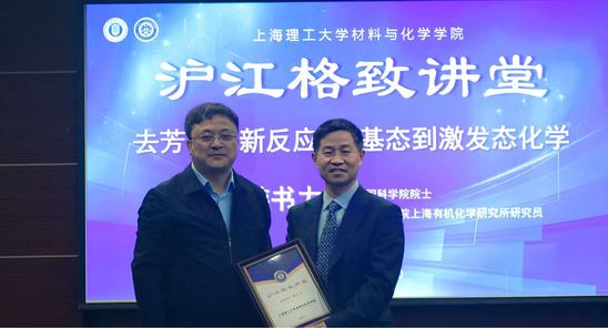 4月22日,材料與化學(xué)學(xué)院舉辦“滬江格致講堂”專題學(xué)術(shù)報(bào)告會(huì),中國科學(xué)院院士、上海有機(jī)化學(xué)研究所研究員游書力應(yīng)邀作題為“去芳構(gòu)化新反應(yīng)——從基態(tài)到激發(fā)態(tài)化學(xué)”的學(xué)術(shù)報(bào)告。校黨委常委、副校長張眾出席活動(dòng)并代表學(xué)校向游院士頒發(fā)紀(jì)念證書。學(xué)院領(lǐng)導(dǎo)班子成員及300余名師生代表參加了報(bào)告會(huì)。