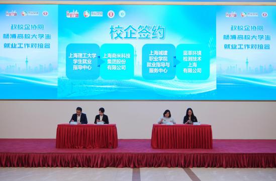 對(duì)接會(huì)上,人社部門負(fù)責(zé)人、區(qū)內(nèi)高校就業(yè)指導(dǎo)部門及部分二級(jí)學(xué)院老師、企業(yè)代表齊聚一堂,共同探討如何通過政府引導(dǎo)、高校培養(yǎng)、企業(yè)吸納整合資源、優(yōu)化就業(yè)服務(wù)。校黨委副書記、副校長劉德強(qiáng)向蒞臨現(xiàn)場(chǎng)的領(lǐng)導(dǎo)、企業(yè)嘉賓、以及兄弟院校同仁表示熱歡迎,他指出希望以本次活動(dòng)為契機(jī),與政校企強(qiáng)化協(xié)同機(jī)制、拓展實(shí)踐平臺(tái)和聚焦創(chuàng)新驅(qū)動(dòng),全力服務(wù)學(xué)生高質(zhì)量就業(yè)。對(duì)接會(huì)現(xiàn)場(chǎng),我校與上海商米科技集團(tuán)股份有限公司、上海城建職業(yè)學(xué)院與藍(lán)莘環(huán)境檢測(cè)技術(shù)上海有限公司簽訂合作框架協(xié)議,區(qū)人社局相關(guān)負(fù)責(zé)人現(xiàn)場(chǎng)發(fā)布特色項(xiàng)目化實(shí)習(xí)崗位,市、區(qū)領(lǐng)導(dǎo)與校方代表共同啟動(dòng)“15分鐘就業(yè)服務(wù)圈”上海理工大學(xué)就業(yè)服務(wù)站。會(huì)議還設(shè)置了分享交流環(huán)節(jié),與會(huì)代表圍繞政策服務(wù)、人才培養(yǎng)和學(xué)生就業(yè)等議題展開討論,為共同構(gòu)建更加完善的就業(yè)生態(tài)體系提供了寶貴思路。