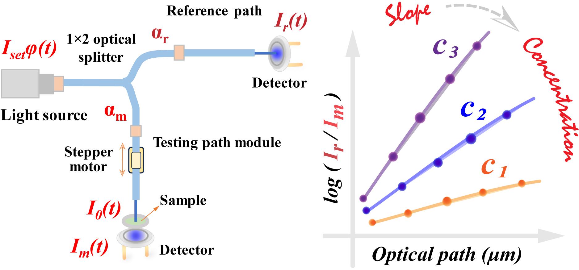 濃度測量是化學(xué)分析、水質(zhì)監(jiān)測、藥物研發(fā)等領(lǐng)域的核心技術(shù)。傳統(tǒng)基于比爾-朗伯定律的吸光光度法依賴固定光程測量樣品對特定波長的吸光度,檢測動態(tài)范圍窄,無法測量高濃度溶液。研究團隊構(gòu)建了高精度測量實驗原理機,通過引入?yún)⒖脊饴穼崟r校正光源波動,在0~20 μm超短光程范圍內(nèi)采集5組光信號,僅在800 ms內(nèi)即可實現(xiàn)對超高濃度液體的超大動態(tài)范圍高精度測量。檢測性能顯著優(yōu)于兩款商用光度計,徹底解決了高濃度樣品“測不了”的難題,突破了高濃度溶液直接檢測的技術(shù)瓶頸,為我國高端分析測量儀器研發(fā)提供了“上理方案”。