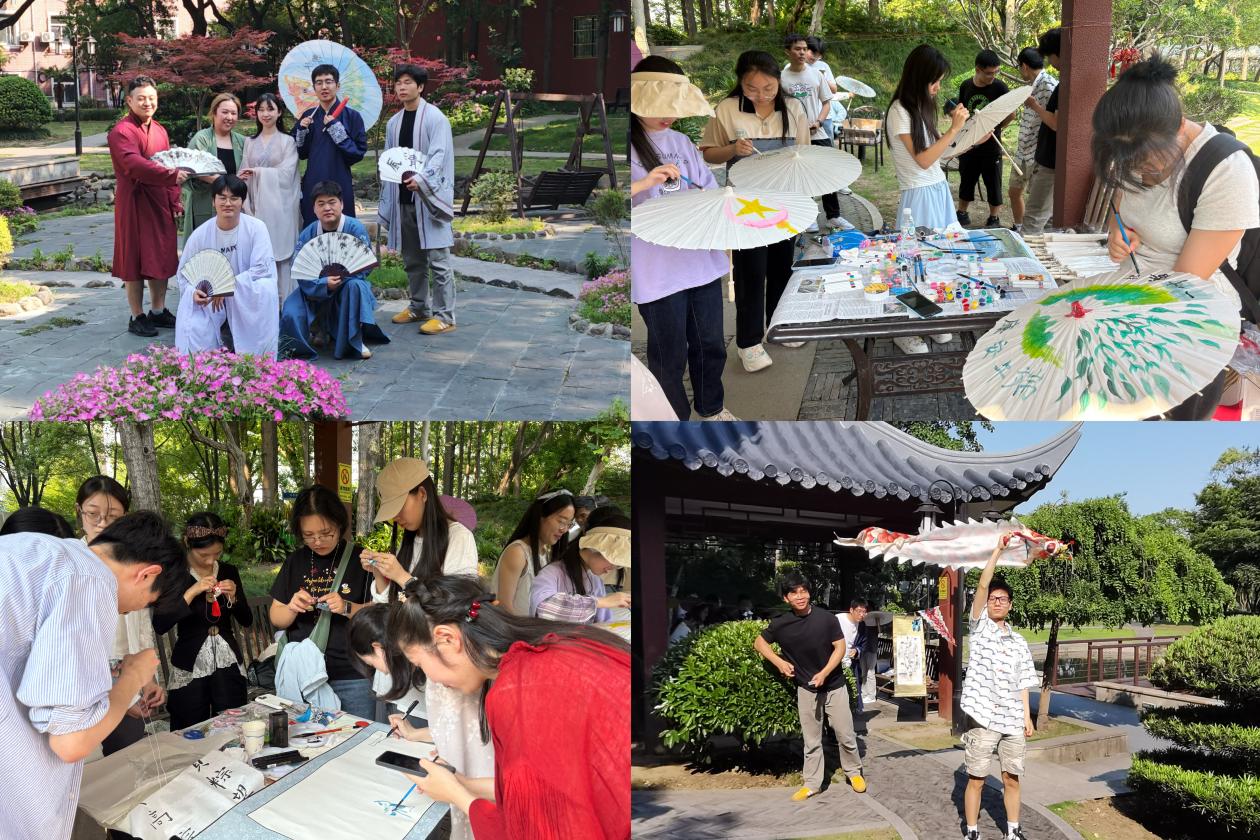 活動(dòng)精心設(shè)置了四大活動(dòng)板塊,將經(jīng)典傳承與創(chuàng)新體驗(yàn)巧妙融合。在“經(jīng)典重現(xiàn)”區(qū),師生化身“江南四大才子”,再現(xiàn)風(fēng)流雅趣;白蛇傳的生動(dòng)演繹穿越時(shí)空,營(yíng)造詩(shī)情古意氛圍?!扒墒纸承摹眳^(qū)則彌漫著艾草清香,師生們親手縫制寓意安康的香粽造型配飾,在素雅紙傘上勾勒水墨畫(huà),或寄情山水,或活潑靈動(dòng),一針一線、一筆一畫(huà)間,端午習(xí)俗以藝術(shù)之美浸潤(rùn)心田。在“龍舞端陽(yáng)”體驗(yàn)區(qū),學(xué)生們各自舞動(dòng)著象征祥瑞的彩布長(zhǎng)龍,感受傳統(tǒng)民俗的魅力。在“詩(shī)韻流長(zhǎng)”區(qū),師生們以筆寄情,撰寫(xiě)端午主題詩(shī)詞,將節(jié)日感悟凝于字句,感受中華詩(shī)詞的永恒魅力。