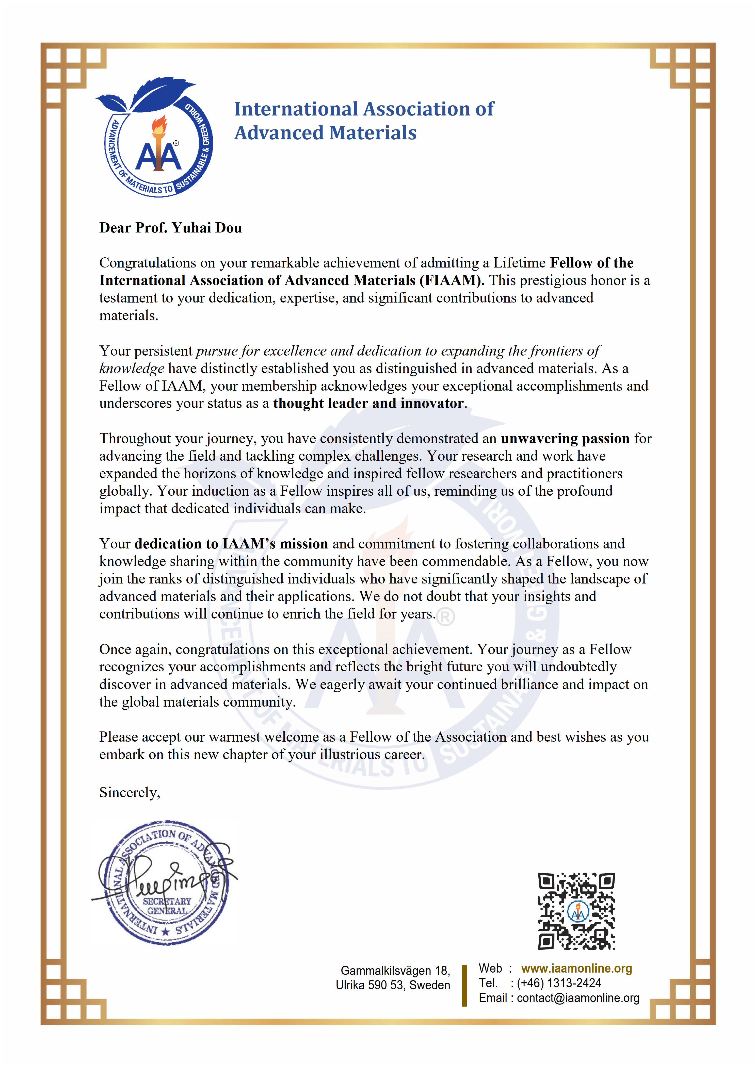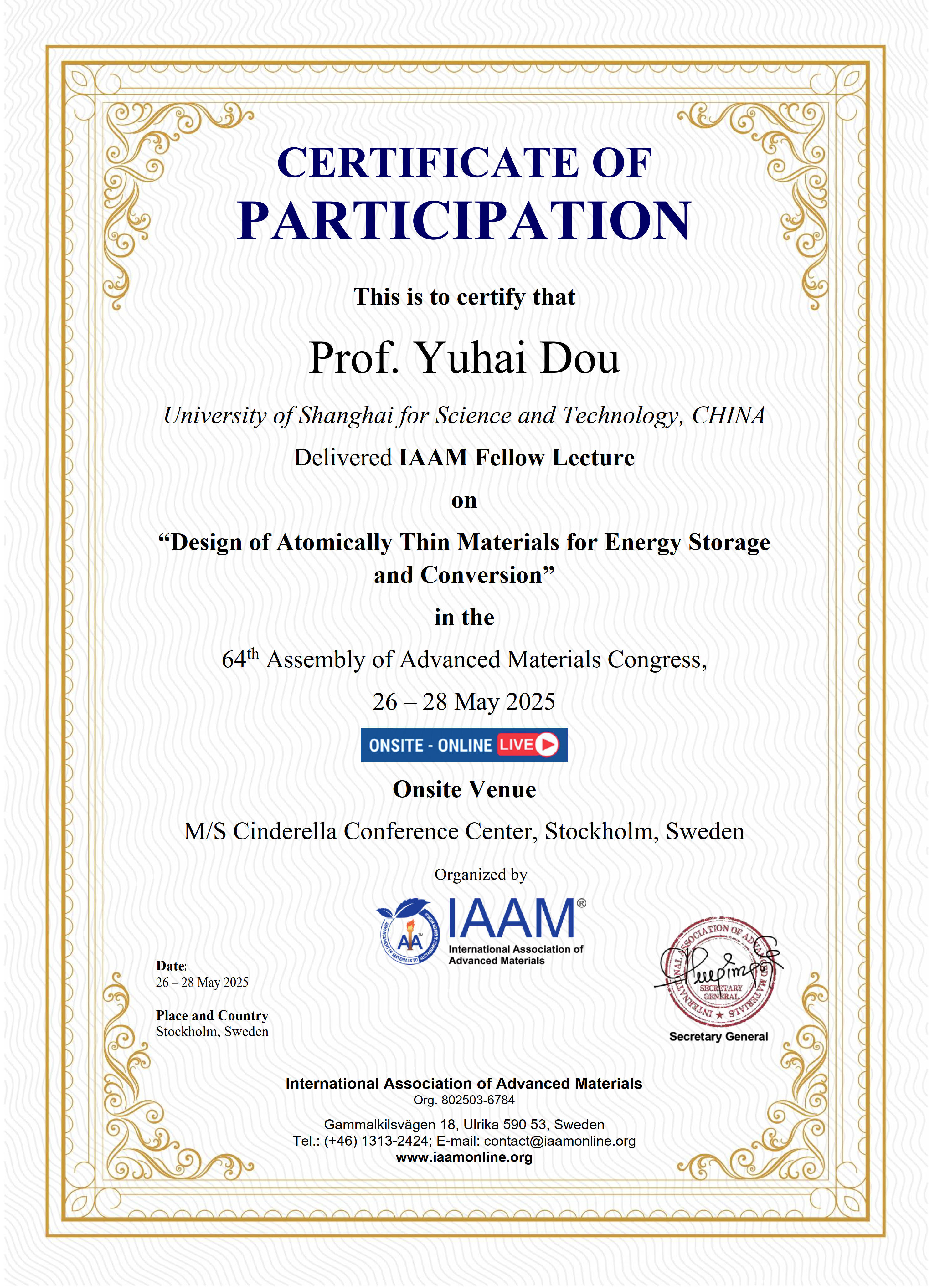 5月28日,上海理工大學(xué)能源材料科學(xué)研究院副院長竇玉海教授被國際先進(jìn)材料協(xié)會(huì)(IAAM, International Association of Advanced Materials)授予“終身會(huì)士”(Lifetime Fellow)榮譽(yù)稱號(hào),以表彰他在新能源材料領(lǐng)域,尤其在原子級(jí)超薄材料方向的前沿探索與貢獻(xiàn)。這是竇玉海教授繼2021年獲頒"IAAM青年科學(xué)家獎(jiǎng)?wù)拢↖AAM Young Scientist Medal)"后,該國際權(quán)威學(xué)術(shù)組織對其科研成就和貢獻(xiàn)的再度認(rèn)可。