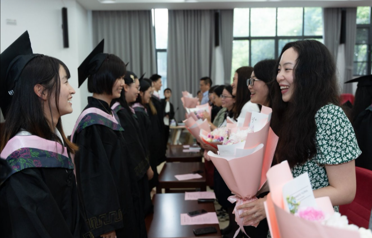 滿懷著期待與祝福,全體畢業(yè)生依次上臺領取證書,主席臺上的領導和嘉賓為畢業(yè)生撥穗正冠。學生代表們?yōu)槔蠋焸儷I上鮮花,感謝一直以來的諄諄教誨。教師代表沈謝天、畢業(yè)生代表方羽奇發(fā)言。