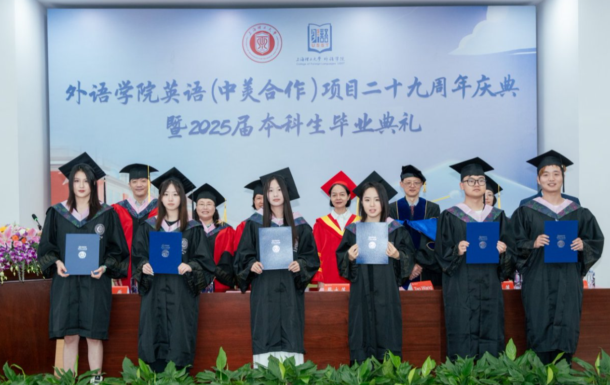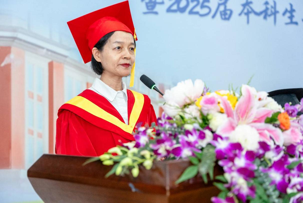 蔡永蓮在致辭中回顧了英語(中美合作)專業(yè)的發(fā)展歷程,向為合作項目付出辛勤努力的中美雙方老師表示衷心的感謝,向各位畢業(yè)生同學表示由衷的祝賀,以今年上海高考作文題"?!まD·傳"為啟,愿青年學予以"專"筑基、以"跨"破界、以"傳"致遠,深耕專業(yè)沃土厚植家國情懷,跨越文化藩籬聯(lián)通世界脈搏,最終成長為有根有魂的文明傳播者。希望全體畢業(yè)生牢記“信義勤愛、思學志遠”校訓,努力工作,展現(xiàn)中國青年的智慧與擔當,向世界傳遞可信、可敬、可愛的中國形象。