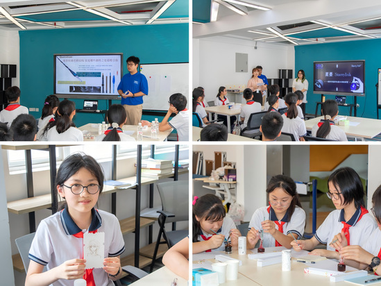 活動(dòng)當(dāng)日,20名七年級(jí)學(xué)生首先走進(jìn)“復(fù)興文脈德育課程”。在上海理工大學(xué)復(fù)興校區(qū)校史館內(nèi),大學(xué)生黨員講解員結(jié)合館內(nèi)展品,以沉浸式體驗(yàn)開(kāi)展愛(ài)國(guó)主義教育。“原來(lái)校史里藏著這么多與國(guó)家發(fā)展同頻共振的故事!”參與學(xué)生表示,通過(guò)參觀校史館,不僅了解了學(xué)校的歷史脈絡(luò),更深刻體會(huì)到“強(qiáng)國(guó)有我”的責(zé)任與擔(dān)當(dāng)。隨后,“科創(chuàng)互動(dòng)勞育課程”以互動(dòng)和體驗(yàn)的形式開(kāi)展。學(xué)院機(jī)器人社成員帶領(lǐng)學(xué)生們深入探索機(jī)器人世界:從講解基礎(chǔ)構(gòu)造到演示操作技巧,學(xué)生們?cè)趯?shí)踐中親手操控機(jī)器人?!霸瓉?lái)編程和機(jī)械配合能讓機(jī)器人完成這么多任務(wù)!”學(xué)生們的科學(xué)興趣被徹底點(diǎn)燃。在“彩色墨水美育課程”環(huán)節(jié),學(xué)生創(chuàng)業(yè)社團(tuán)“星墨”以“墨水的前世今生”為引,結(jié)合化學(xué)原理講解植物提取物制作環(huán)保墨水的過(guò)程。學(xué)生們通過(guò)動(dòng)手實(shí)驗(yàn),直觀感受天然色彩的奇妙變化,隨后,他們用環(huán)保墨水繪制創(chuàng)意作品,并進(jìn)行分組展示?!霸瓉?lái)化學(xué)也能這么‘美’!”一名學(xué)生舉著自己的畫(huà)作興奮地說(shuō)。