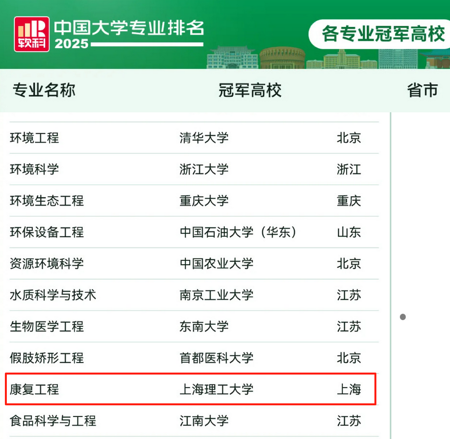 6月18日,高等教育專業(yè)評價機(jī)構(gòu)軟科發(fā)布“2025軟科中國大學(xué)專業(yè)排名”,我校健康科學(xué)與工程學(xué)院康復(fù)工程專業(yè)獲評A+評級,排名全國第一,彰顯了該專業(yè)在國內(nèi)相關(guān)領(lǐng)域的領(lǐng)先地位和持續(xù)影響。