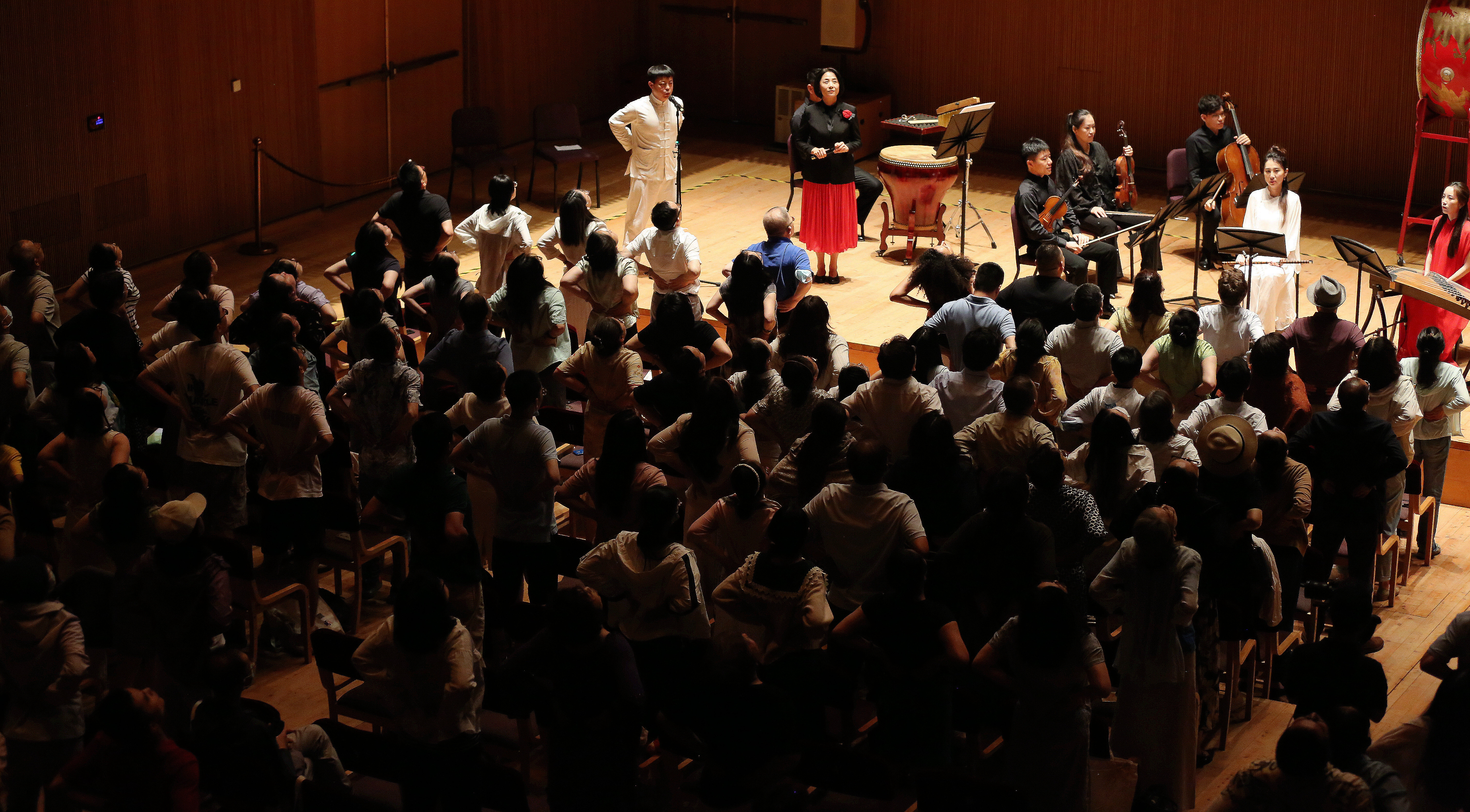 同時,在音樂會現(xiàn)場,學生團隊協(xié)助徐海朋副教授完成了導(dǎo)引法的現(xiàn)場演示與互動體驗環(huán)節(jié),引導(dǎo)觀眾跟隨音樂的律動進行吐納,將身體的氣韻與五音的節(jié)奏相互呼應(yīng),讓觀眾在音樂與導(dǎo)引的雙重滋養(yǎng)下,感受身心的和諧與平衡。