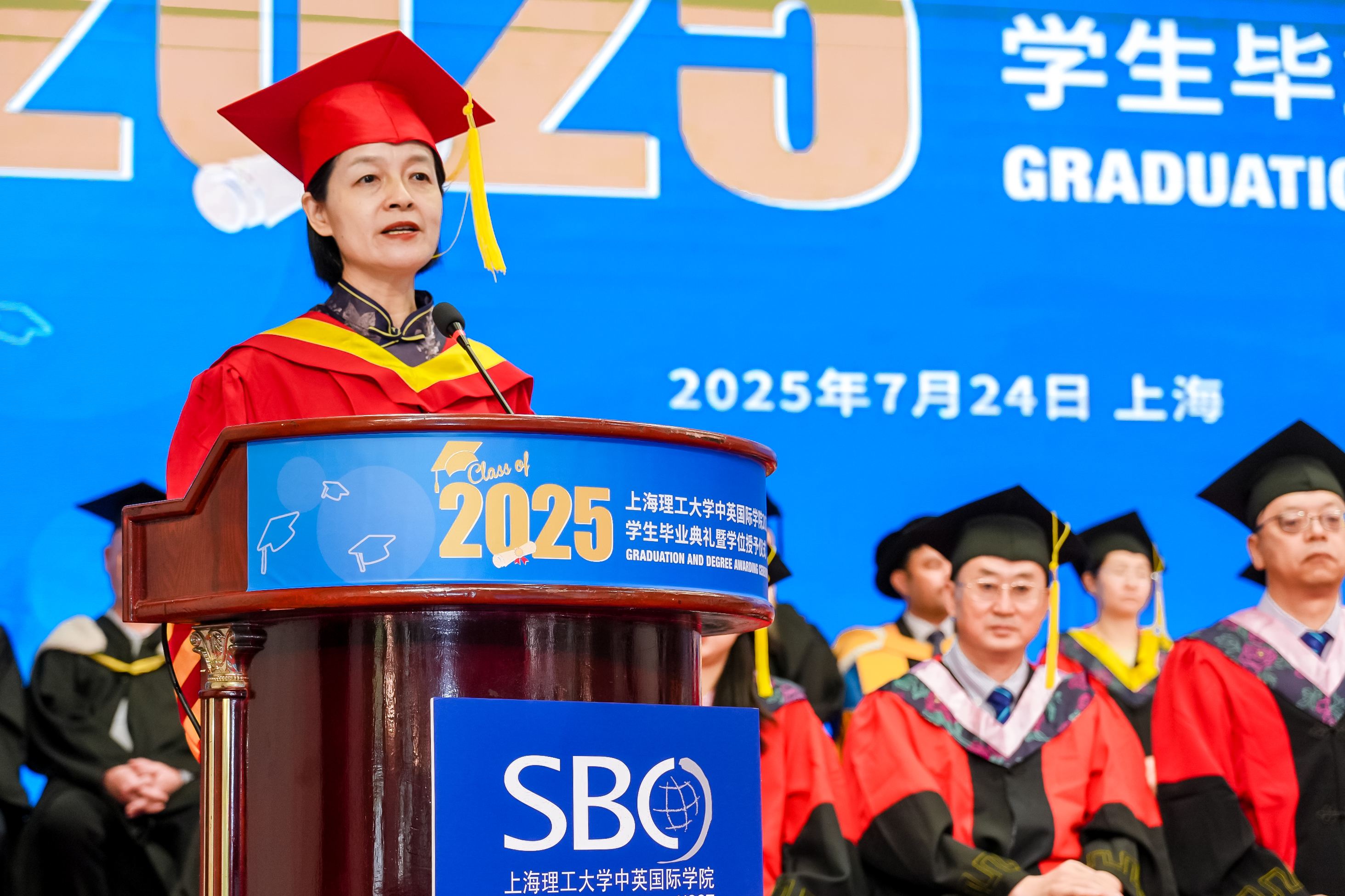 驪歌輕起,青春如熾。7月24日下午,上海理工大學(xué)中英國際學(xué)院2025屆學(xué)生畢業(yè)典禮暨學(xué)位授予儀式在學(xué)校大禮堂舉行。上海理工大學(xué)副校長、中英國際學(xué)院院長蔡永蓮,哈德斯菲爾德大學(xué)校長羅伯特·安東尼·克萊恩(Robert Anthony Cryan),謝菲爾德哈勒姆大學(xué)校長莉茲·莫索普(Liz Mossop),利物浦約翰摩爾大學(xué)副校長艾琳·瓊斯(Aileen Jones),上海理工大學(xué)教務(wù)處處長單彥廣,國際交流處處長陳琦,管理學(xué)院院長趙來軍,中英國際學(xué)院黨委書記李妍,黨委副書記、副院長(主持行政工作)、代理執(zhí)行院長張崢,黨委副書記、副院長蔡卉,以及英國合作大學(xué)相關(guān)部門負(fù)責(zé)人、英國工程技術(shù)學(xué)會(huì)負(fù)責(zé)人、光電信息與計(jì)算機(jī)工程學(xué)院、機(jī)械工程學(xué)院、管理學(xué)院專業(yè)負(fù)責(zé)人、中英國際學(xué)院教師代表、畢業(yè)生代表及其親友共計(jì)400余人共同見證這一重要時(shí)刻。典禮由中英國際學(xué)院黨委副書記、副院長蔡卉主持。