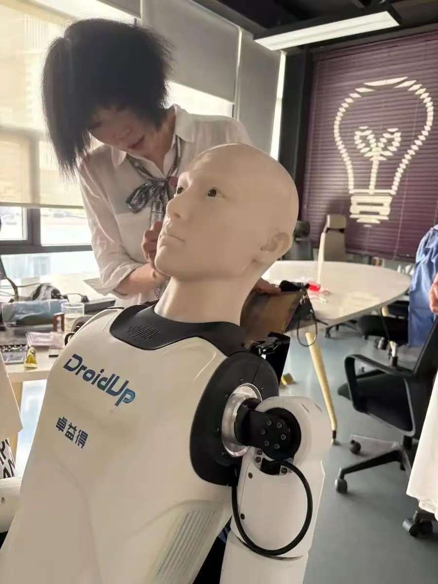 身高1.75米,體重30公斤左右,一張俊雅的面龐,動(dòng)作流暢,能與人做肢體互動(dòng)……乍一看,不會(huì)意識(shí)到,這是機(jī)器。“學(xué)霸01”,“身體”是在北京舉辦的全球首屆人形機(jī)器人半程馬拉松賽上獲得季軍的“行者二號(hào)”的優(yōu)化版,是上海理工大學(xué)智能機(jī)器研究院李清都教授團(tuán)隊(duì)的杰作;面部表情與真人極其接近,皮膚由硅膠制成,觸摸起來(lái)還有彈性。膚色健康紅潤(rùn),則是由其導(dǎo)師楊青青教授創(chuàng)作的妝造形象。