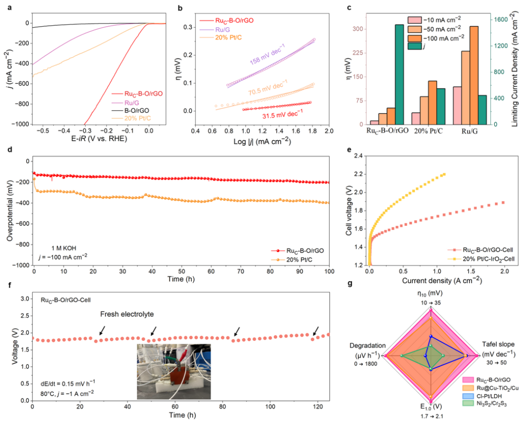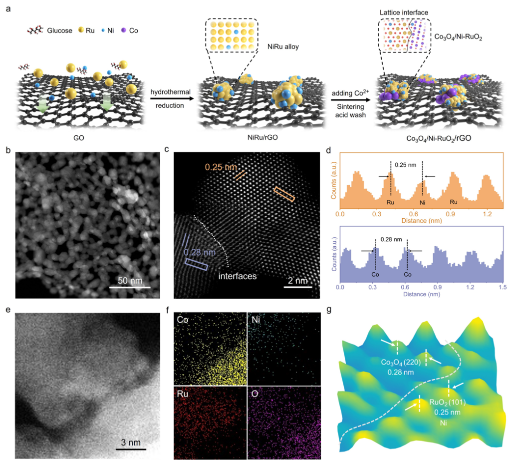 以上方案有效解決了電解水產(chǎn)氫技術(shù)成本高、效率低和循環(huán)壽命短的核心難題,實(shí)現(xiàn)了催化劑成本降低至25%,產(chǎn)氫效率提高了約13倍和連續(xù)循環(huán)運(yùn)行100h無衰減的功效。此外,通過引入鎳原子摻雜二氧化釕和氧化鈷異質(zhì)結(jié)構(gòu)設(shè)計(jì)(圖1),進(jìn)一步降低了催化劑的過電位(η10 =195 mV)并提高了釕的溶解保持率(100 mg/cm2電流密度下循環(huán)20小時(shí),保持率高達(dá)94.1%),實(shí)現(xiàn)活性與穩(wěn)定性的統(tǒng)一。在模擬實(shí)際工況AEMWEs測(cè)試中,催化劑在產(chǎn)氫電流密度為1 A/cm2時(shí)的電位僅為1.73 V,且釕貴金屬的載量?jī)H為0.1 mg/cm2,綜合性能優(yōu)于2024年美國(guó)能源部的具體要求(圖2)。