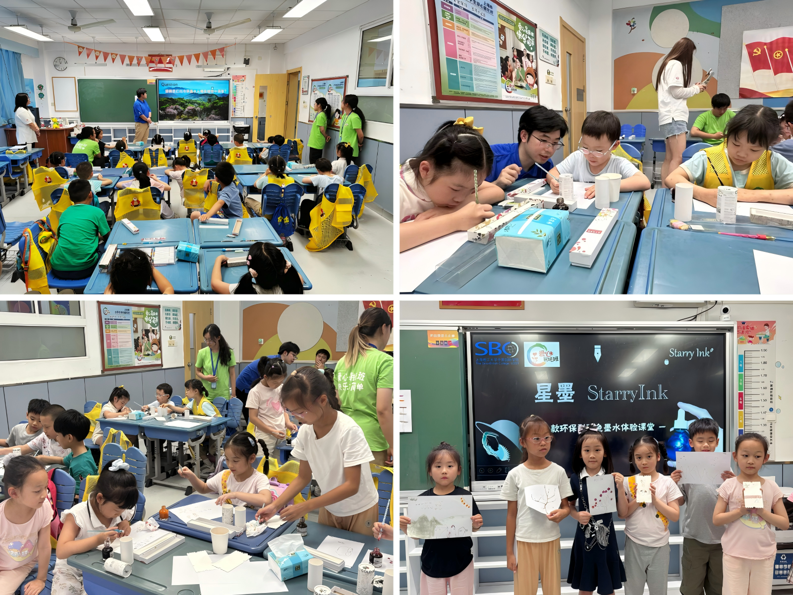 7月7日、17日、29日及8月14日,中英國際學(xué)院的老師、創(chuàng)新領(lǐng)導(dǎo)力中心的學(xué)生們及星墨科創(chuàng)團(tuán)隊成員組成科創(chuàng)講師團(tuán),在雁蕩路七色花小學(xué)開展了主題為“星墨:環(huán)保彩色墨水課堂”的研學(xué)活動,為瑞金二路街道暑托班二至五年級的孩子們,帶來了一場融合美育與科創(chuàng)的奇妙體驗。課堂從“墨水的前世今生”娓娓道來,通過課件展示、視頻講解、互動提問等豐富形式,幫助孩子們學(xué)習(xí)色彩的原理,了解墨水的起源。實踐環(huán)節(jié),天然植物制成的安全環(huán)保彩色墨水變身為教具,孩子們化身“小小畫家”,嘗試使用玻璃筆和彩色墨水創(chuàng)作畫作,在動手實踐中感受科技與藝術(shù)的交融?!霸瓉砟梢赃@么環(huán)保又漂亮!”一位三年級學(xué)生在完成作品后興奮地說道。孩子們在一片歡聲笑語中增長本領(lǐng)見識,啟蒙科創(chuàng)思維。