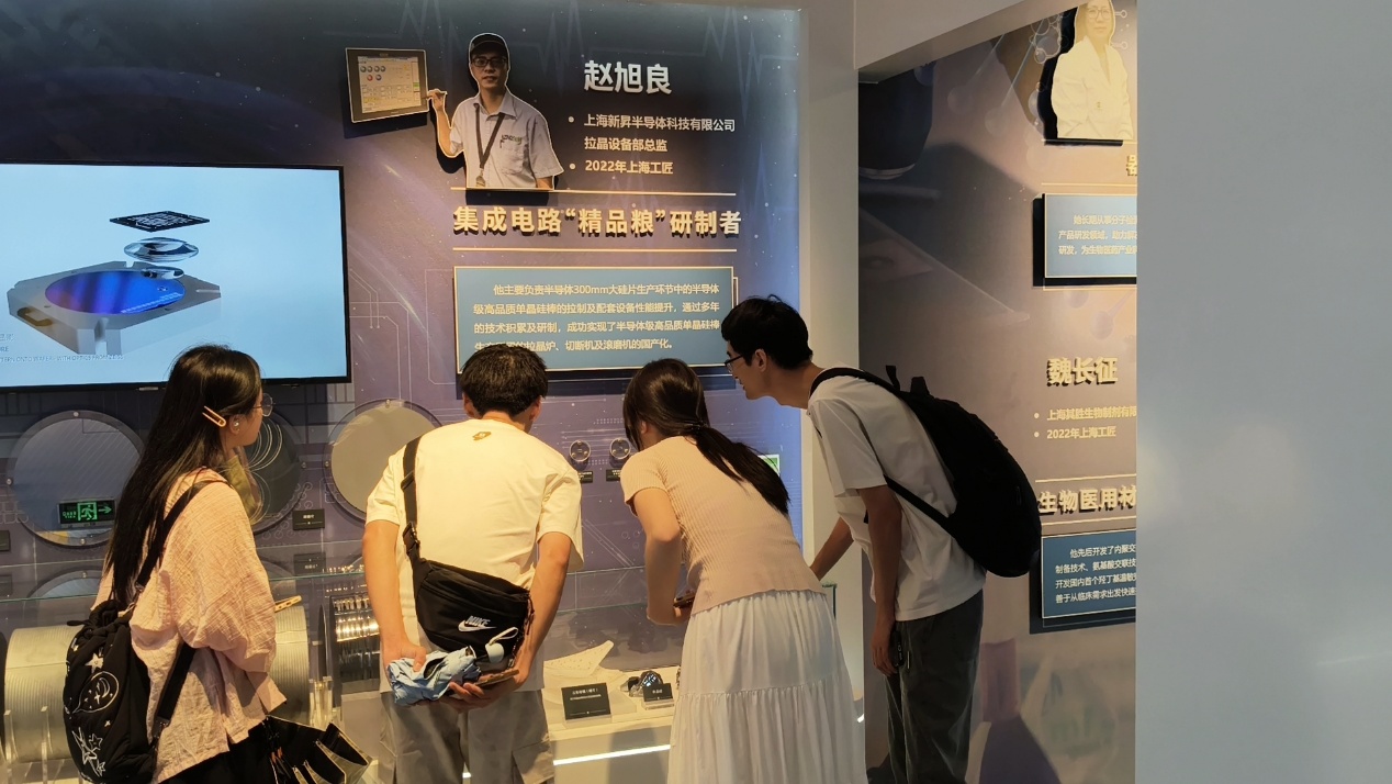 一進(jìn)入上海工匠館,石英坩堝碎片、多晶硅和單晶硅等芯片制造原始基石樣品便吸引了隊(duì)員目光。墻上播放的芯片制造全流程視頻,生動(dòng)展示從“生產(chǎn)單晶硅棒”到“芯片封裝”的十一步工序,詮釋砂粒蛻變?yōu)椤肮I(yè)糧食”的過(guò)程。在這里,隊(duì)員們了解到2022年上海工匠趙旭良實(shí)現(xiàn)單晶硅棒關(guān)鍵生產(chǎn)設(shè)備國(guó)產(chǎn)化的突破,以及2021年上海工匠李冰寒主導(dǎo)開(kāi)發(fā)多個(gè)技術(shù)節(jié)點(diǎn)閃存工藝平臺(tái)的故事。實(shí)物、視頻與工匠故事的交織,讓隊(duì)員深刻認(rèn)識(shí)到,半導(dǎo)體自主之路既需高深理論,更依賴(lài)工匠對(duì)“精微”的極致追求和對(duì)“卡脖子”難題的不懈攻堅(jiān)。