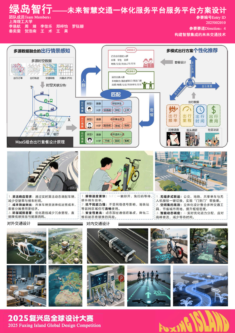 依托于李文翔課題組的研究成果,交通運輸專業(yè)碩士研究生李慈航、周婧、李佳樂,交通工程專業(yè)本科生羅鈺姍、賀浩南、王術、王果等同學,聚焦“構(gòu)建智慧集成的未來交通技術”賽道,以“出行即服務(Mobility as a Service, MaaS)”為理念,設計了“水—陸—空”多維協(xié)同的復興島未來智慧交通一體化服務平臺方案,涵蓋智能輪渡、水上巴士、自動駕駛接駁車、液態(tài)公交、無人機客貨運等多種新型交通方式,并集成旅游訂票、生活消費、低碳積分等增值服務,開發(fā)面向不同用戶群體的個性化MaaS套餐,旨在為復興島居民與游客提供一站式智慧出行體驗。