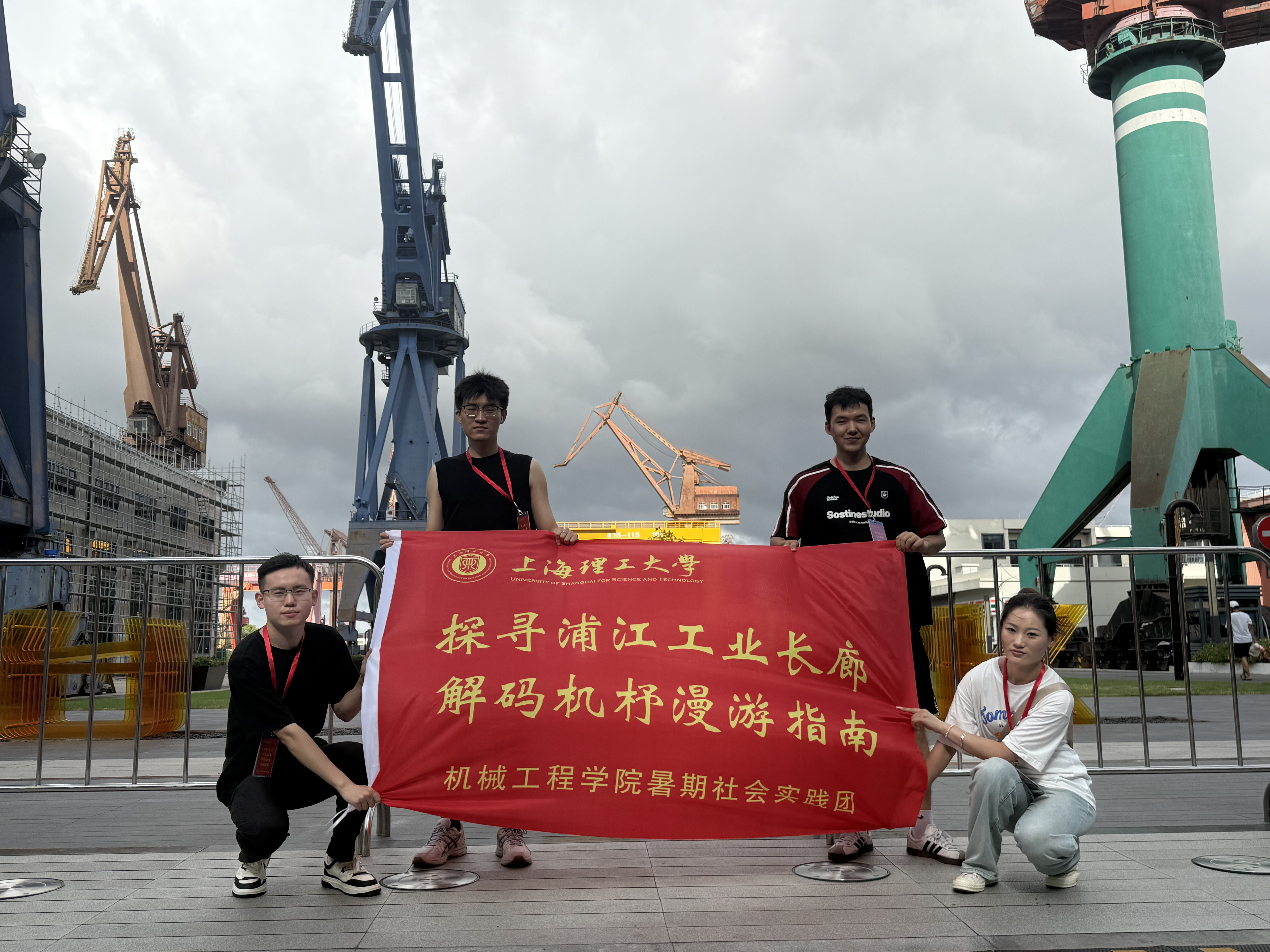 晨光中的復(fù)興島船臺(tái)公園,銹色的龍門吊靜靜佇立,仿佛時(shí)光凝固。隊(duì)員們撫過斑駁的鋼架結(jié)構(gòu),在褪色的標(biāo)語(yǔ)前駐足良久。沿著濱江道繼續(xù)前行,楊樹浦電廠那標(biāo)志性的煙囪映入眼簾——它不再噴吐煤煙,卻以沉默的姿態(tài)述說著上海工業(yè)革命的輝煌往昔。滬東中華造船廠,巨大的船塢中仍回蕩著建設(shè)者的號(hào)子;而改造成藝術(shù)空間的毛麻倉(cāng)庫(kù)舊址,則展現(xiàn)出新舊共生的奇妙張力。同學(xué)們拿出測(cè)繪本、相機(jī)和無(wú)人機(jī),記錄下不同工業(yè)地標(biāo)的形態(tài)、結(jié)構(gòu)與空間特征。有人仔細(xì)描摹鑄鐵樓梯的紋樣,有人專注分析廠房桁架的受力結(jié)構(gòu)——這些機(jī)械學(xué)子正在用專業(yè)語(yǔ)言與歷史對(duì)話。